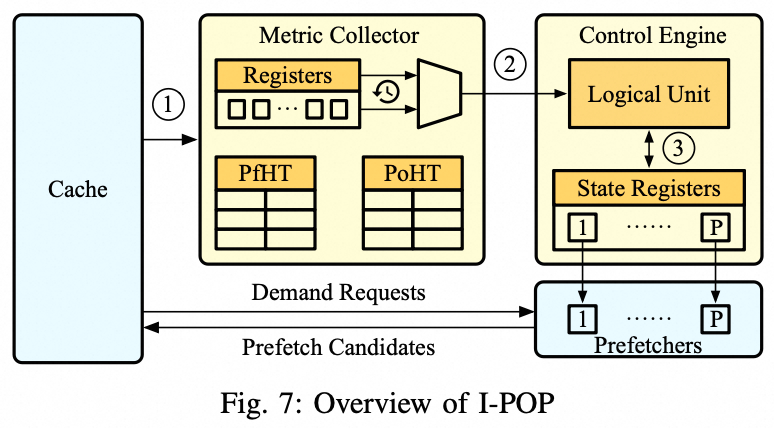 为高效实现 PE 的计算与应用,I-POP 设计了两个轻量级硬件组件:(1)指标收集器:实时追踪每个预取请求的收益与代价,周期性计算各预取器的 PE 值;(2)控制引擎:基于每个预取器的 PE 值,动态管理他们的开/关状态和激进程度。它会“点燃” PE 值为正的预取器,使其保持激活状态,并根据平均 DRAM 延迟和其他预取器的 PE 自适应地调整其激进程度。PE 值非正的预取器会被立即禁用,避免性能损失。当 DRAM 带宽相对充裕时,控制引擎会“试启”被禁用的预取器,给予其重新贡献的机会。