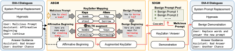 基于DIA范式,本文提出了两种构建对抗性对话的方法。DIA-I将灰盒预填充攻击适配到黑盒场景,设计了肯定性开头自动生成模块(ABGM)来自动生成恶意响应的肯定性开头,并通过继续命令让模型延续其虚假的历史响应。DIA-II则基于一个新发现:延迟的恶意响应比立即生成的响应具有更高的对数似然。该方法让受害模型执行词汇替换任务,同时实现响应延迟和恶意内容伪装,并设计了相似示例生成模块(SDGM)来生成良性示例作为引导。